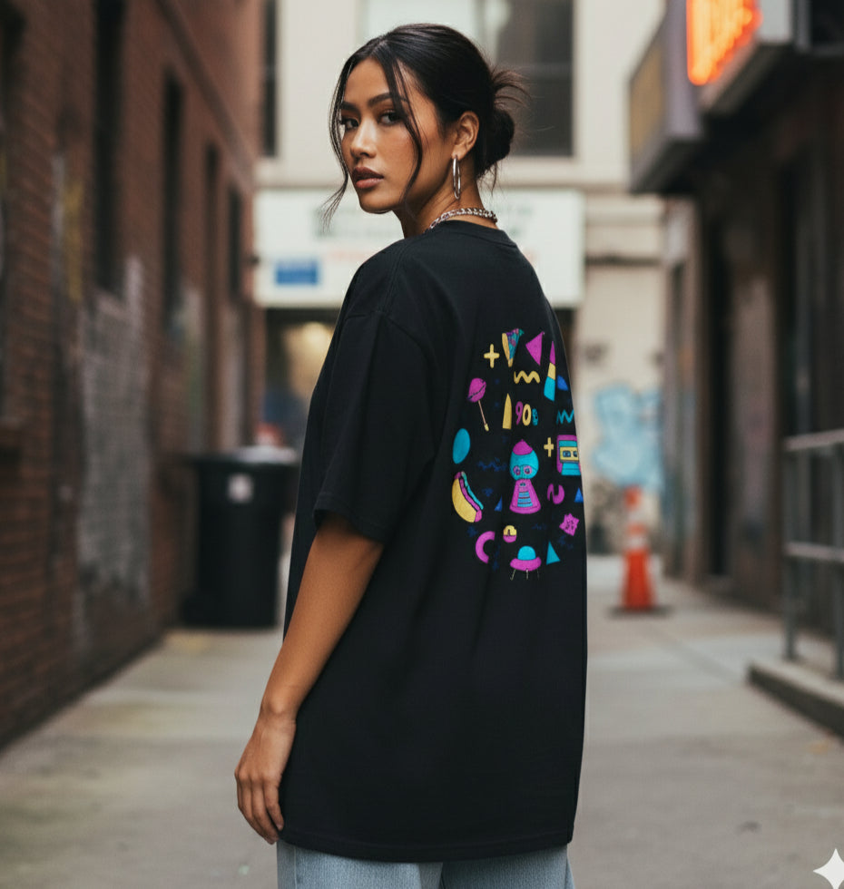 זה לא עוד עיצוב – זה אוסף זיכרונות של דור שלם. 90s Vibes מחזירה את כל הסמלים הקטנים שהפכו את התקופה לקסומה: קסטות, מסטיקים, פיצה וצבעים זוהרים. חולצה שמכניסה חיוך עוד לפני שלבשת אותה.