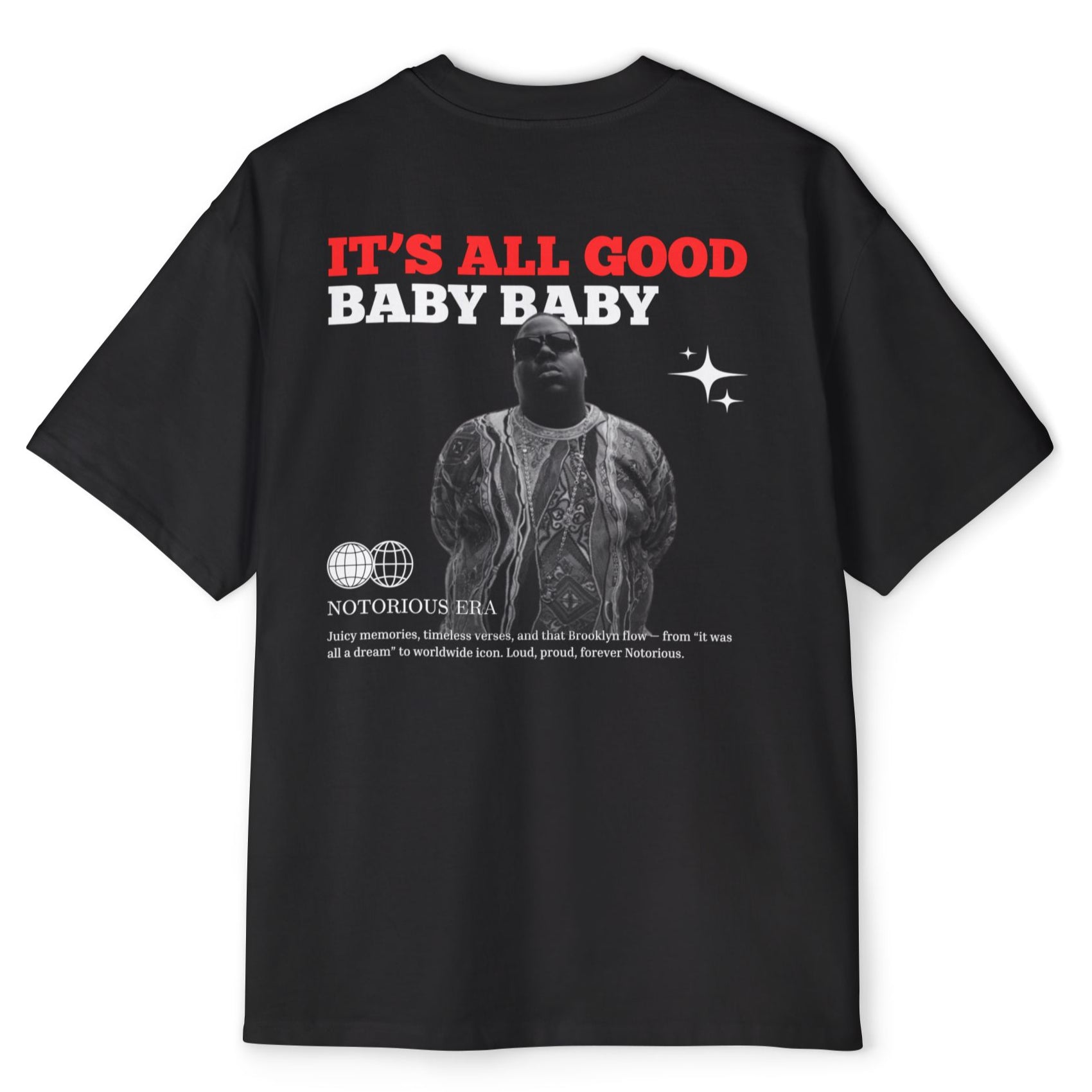 שנות ה־90 היו שלו. ביגי סמולס – הסמל של ראפ חכם, ביטחון עצמי וסטייל רחוב ניו-יורקי אמיתי. החולצה הזו מביאה את הווייב ההוא – השילוב המושלם בין ביטים כבדים, טקסטים שנכנסים ללב, ואסתטיקה שממשיכה להגדיר תרבות עד היום.